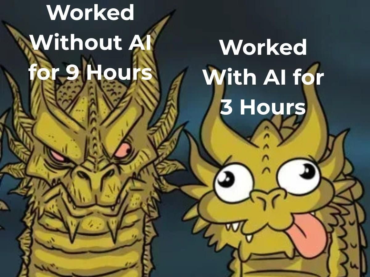 Alt Text: Before and after meme showing exhausted worker without AI tools versus energized worker using AI productivity tools with reduced work hours. Image name: ai-productivity-before-after-meme.jpg
