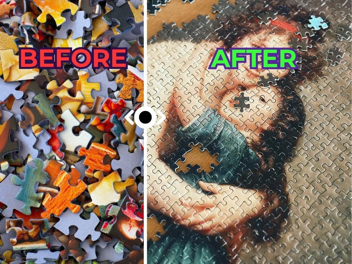 Alt text: Split comparison showing scattered puzzle pieces labeled 'before' transforming into completed organized puzzle labeled 'after' representing AI-powered task management. Image name: ai-workflow-organization-before-after.jpg